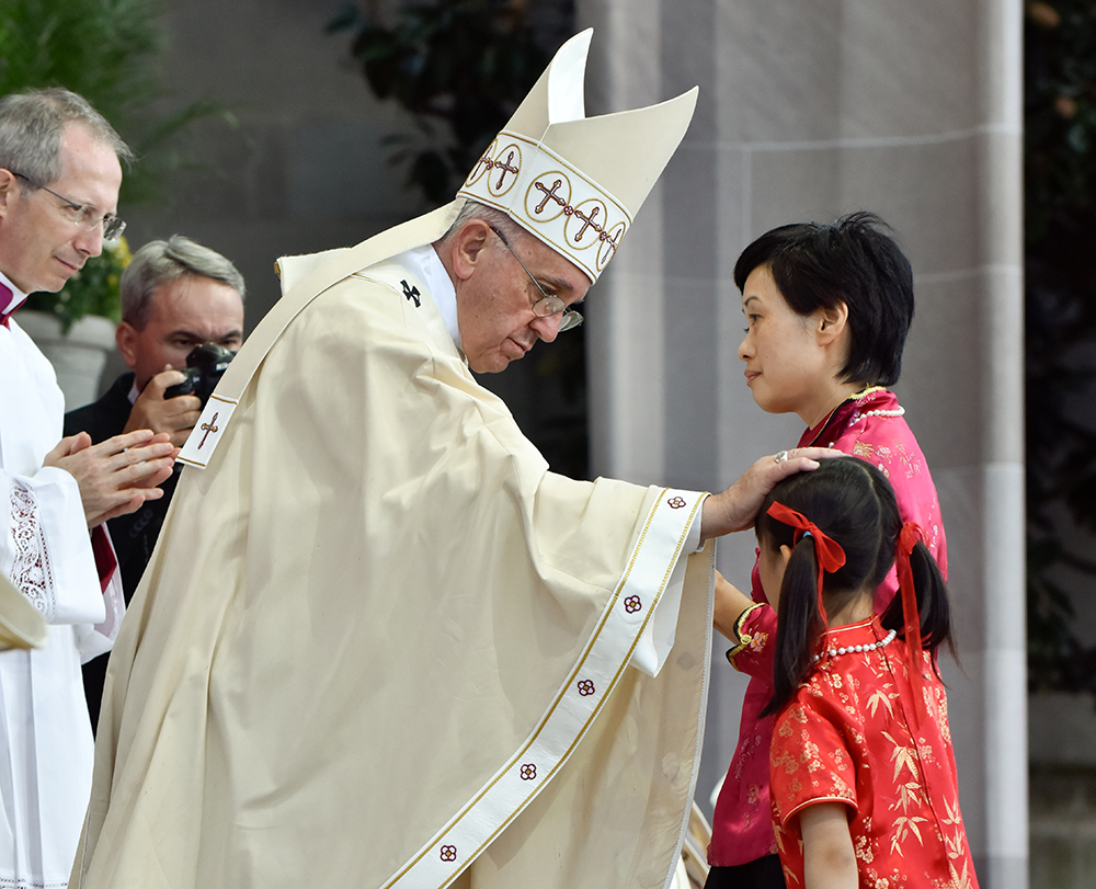 Pope Francis blesses a girl as he receives the offertory gifts during the Mass of canonization of Junipero Serra outside the Basilica of the National Shrine of the Immaculate Conception in 2015 in Washington. In an Oct. 2 Pew Research Center poll, U.S. Catholics by a 2-to-1 margin feel Pope Francis is doing a fair or poor job on the clergy sex abuse issue. (CNS photo/Matthew Barrick)