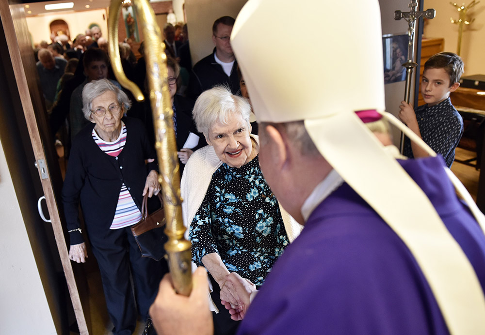 Bishop Edward J. Burns greeted Gloria Haddock after celebrating a special Christmas Mass with seniors of St. Joseph Residence on Dec. 2. (Ben Torres/Special Contributor)