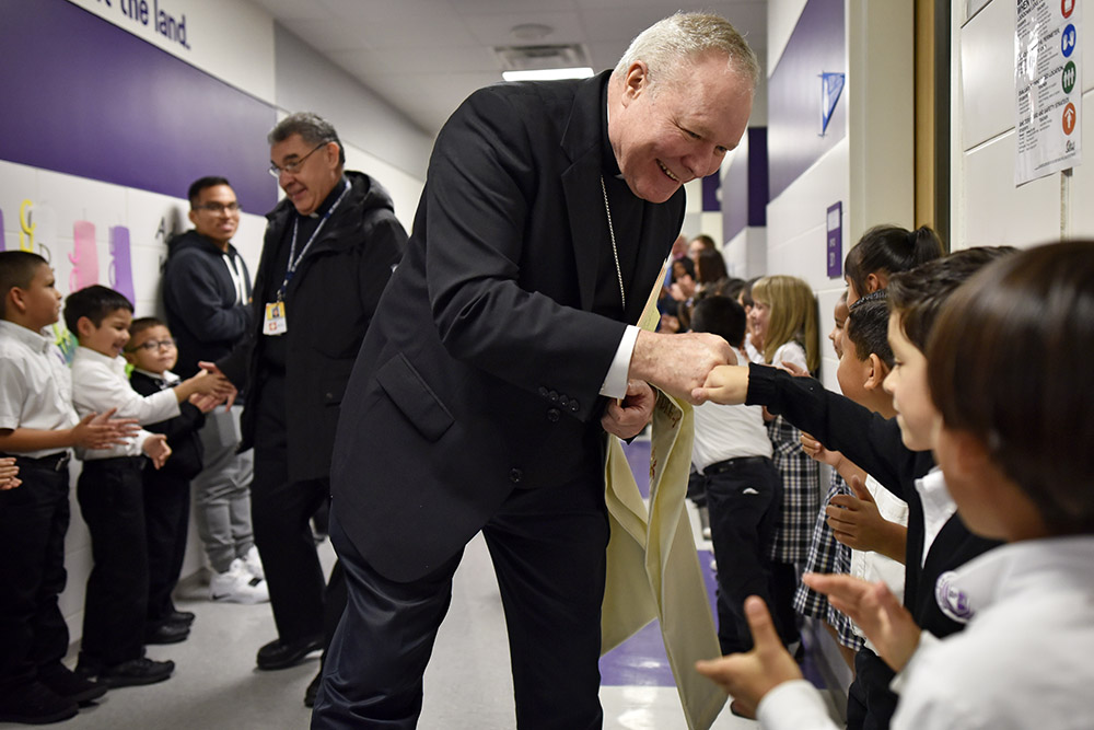 Bishop Edward Burns greets students with fist-bumps before conducting a special dedication ceremony for a new wing at St. Philip & St. Augustine Catholic Academy on Dec. 13.