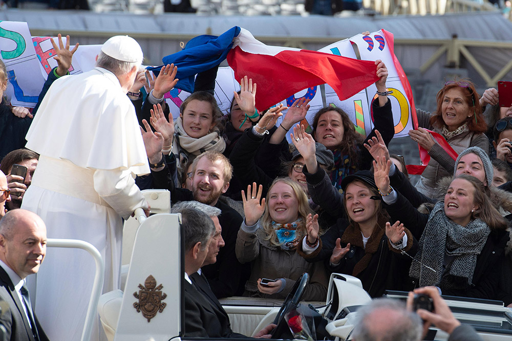 Pilgrims wave as Pope Francis arrives for his general audience in St. Peter’s Square at the Vatican Feb. 27, 2019. (CNS photo/Yaraara Nardi, Reuters)