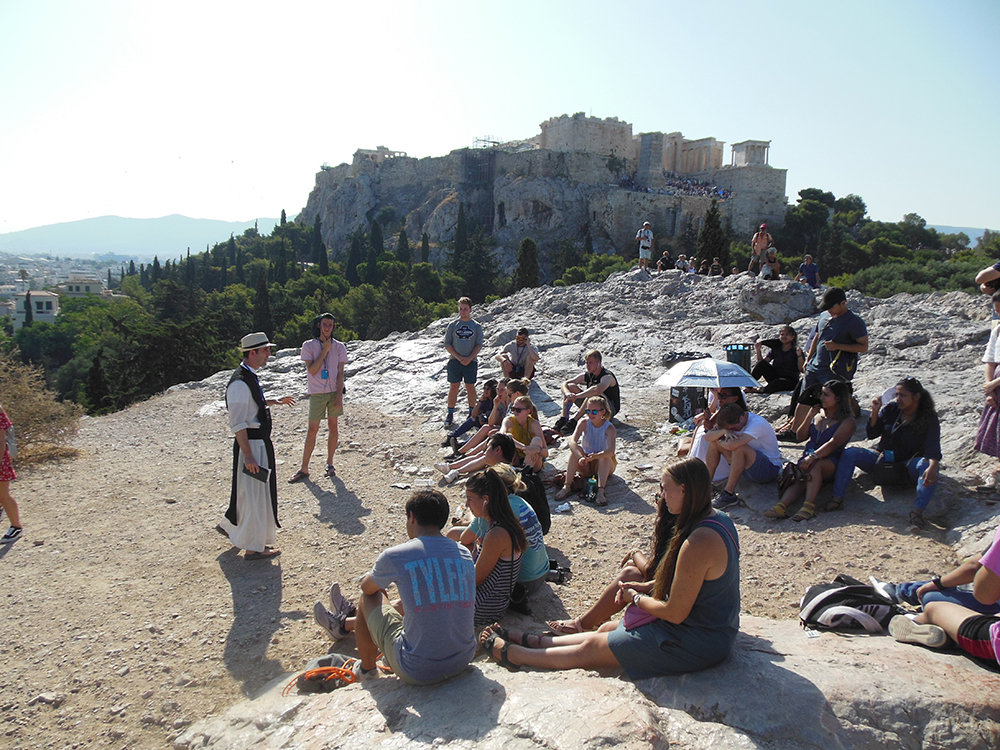 Father Thomas Esposito, left, discusses St. Paul while at the Areopagus in Greece while accompanying participants in a University of Dallas summer program.