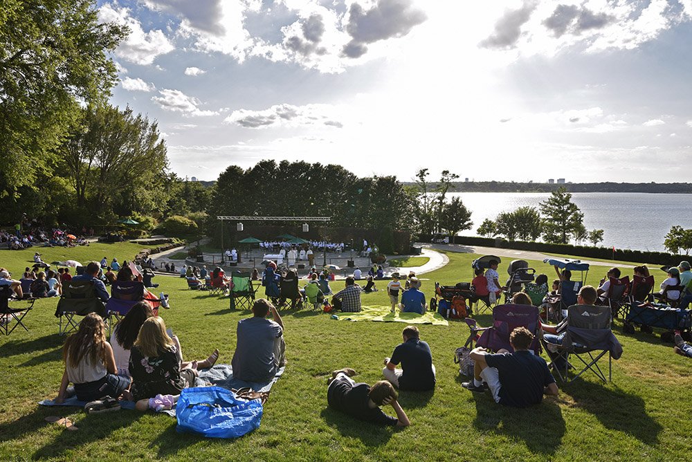 People sit on blankets and chairs as they listen to a homily by Father Jonathan Austin, pastor of St. Jude Chapel, during Our Celebration of Faith Mass at the Dallas Arboretum on June 15. (BEN TORRES/Special Contributor)