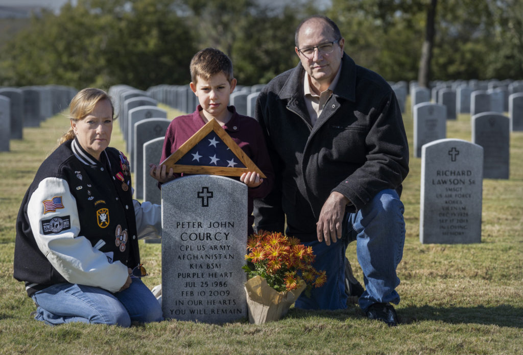 Mary Bush, left, with her son Luke and husband Chris visit Dallas-Fort Worth National Cemetery to honor the memory of her son U.S. Army Cpl. Peter J. Courcy, 22, who was killed in action in Salerno, Afghanistan on Feb. 10, 2009. DAVID WOO/Special Contributor