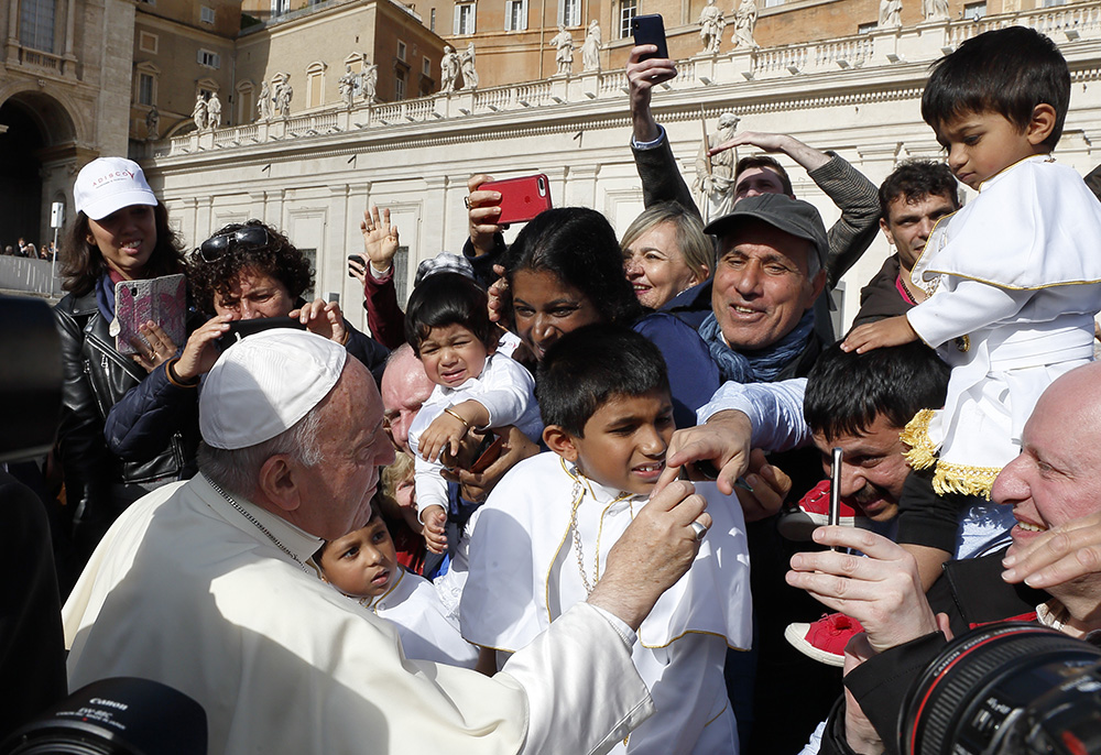 Pope Francis greets family members, including boys dressed as the pope, during his general audience in St. Peter’s Square at the Vatican Nov. 13, 2019. (CNS photo/Paul Haring)