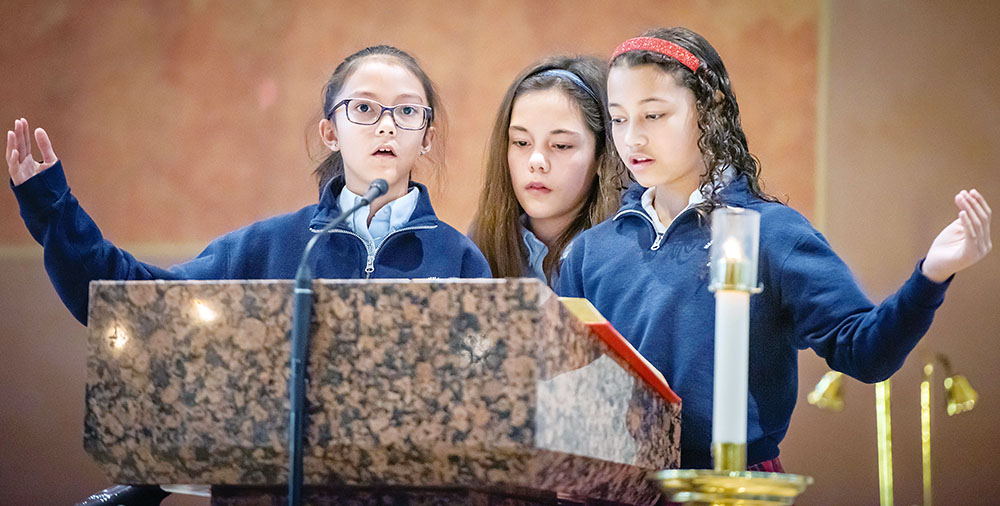 Fifth-graders Kindle Cudal, Joanna Jodziewicz and Liza Rojas Sanzonetti lead the responsorial Psalm during the school’s 60th Jubilee Mass at the Mary Immaculate Catholic School h in Farmers Branch, Texas, Saturday, Nov. 9, 2019. (Ron Heflin)