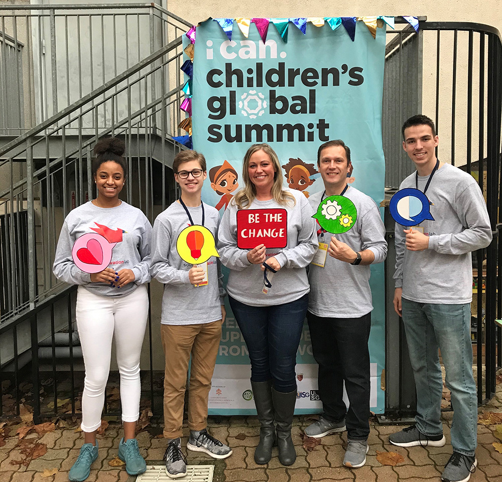From left, Delinah Hailey, Ethan Gant, Associate Dean Melissa Downs, Lab Director Frank Santoni and Sebastian Conklin represented John Paul II High School in Plano at the iCan Design for Change Summit in Rome Nov. 27-30.