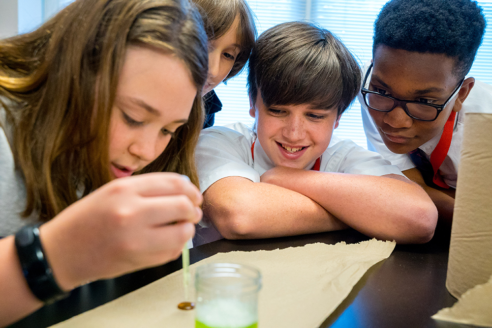 Bishop Dunne Catholic School seventh-grade honor students, from left, Addison Kuykendall, Michael Horick, Royce Szarynski and Emerson Morris conduct an experiment during class at the Oak Cliff campus. (Bishop Dunne Catholic School photo)