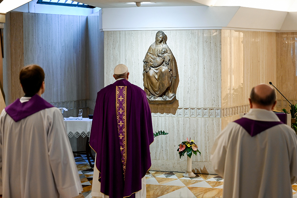 Pope Francis celebrates Mass March 16, 2020, in the chapel of his Vatican residence, the Domus Sanctae Marthae. At the beginning of the liturgy, the pope prayed for families who are cooped up in their homes and for all those who are ill with COVID-19. (CNS photo/Vatican Media)