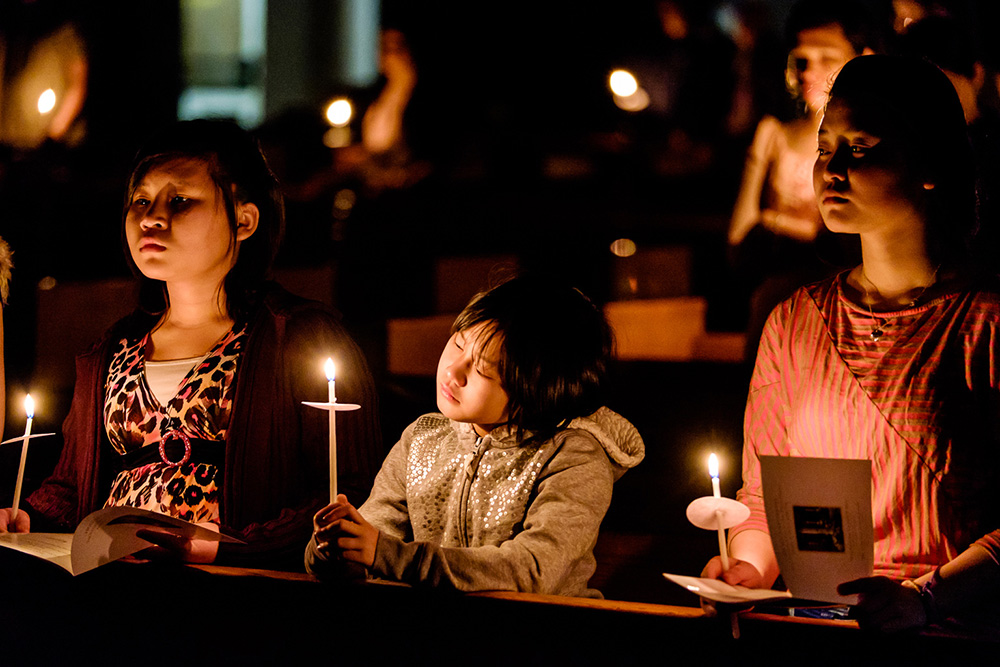 Young people hold candles during the Easter Vigil at the Cathedral of St. Joseph in Hartford, Conn., April 4, 2015. (CNS photo/Bob Mullen)
