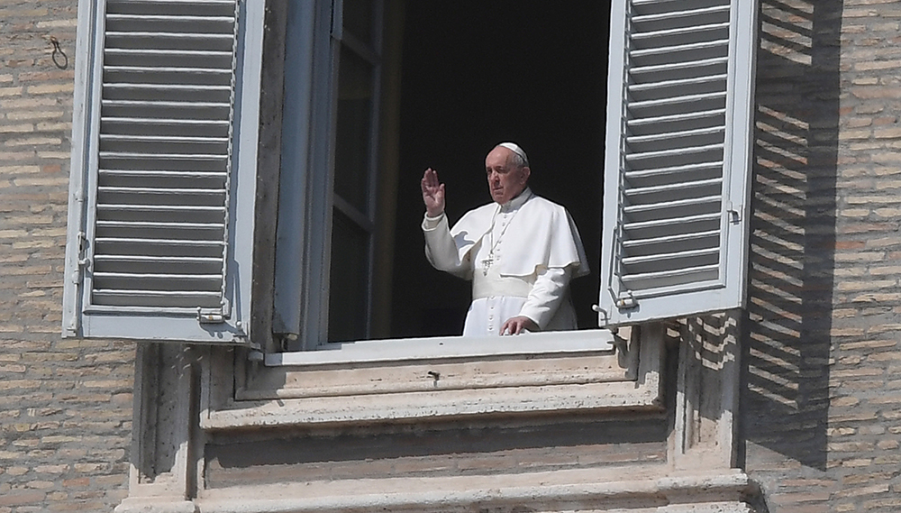 Pope Francis is seen in a window greeting a few nuns standing in St. Peter’s Square at the Vatican March 22, 2020, after reciting his weekly Angelus prayer from the library of the Apostolic Palace. The pope announced he will give an extraordinary blessing “urbi et orbi” (to the city and the world) at 6 p.m. Rome time March 27 in an “empty” St. Peter’s Square because all of Italy is on lockdown to prevent further spread of the coronavirus. (CNS photo/Alberto Lingria, Reuters)