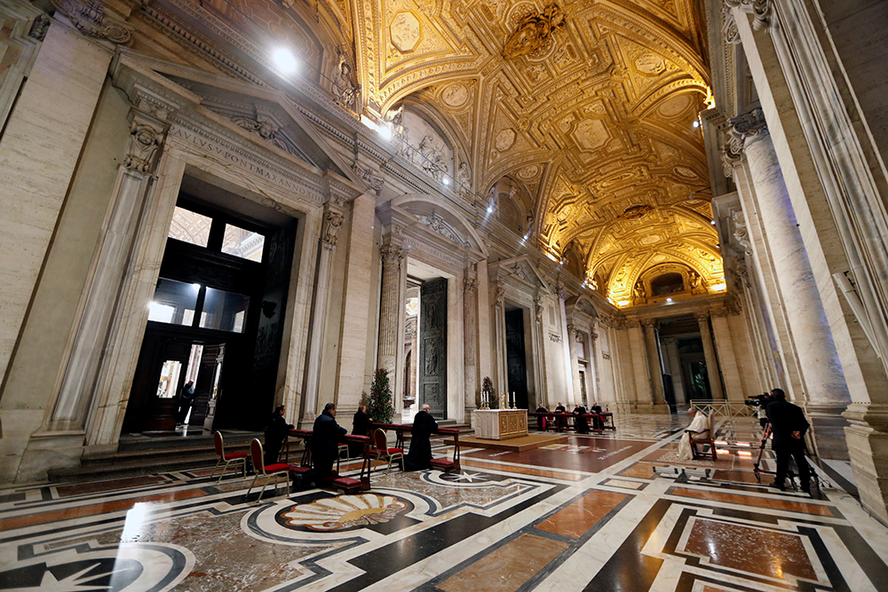 Pope Francis prays in the atrium of St. Peter’s Basilica at the Vatican March 27, 2020. The pope led a prayer service for the world, suffering from the coronavirus pandemic, and gave his blessing “urbi et orbi” (to the city and the world). The service was livestreamed because of COVID-19 quarantines. (CNS photo/Yara Nardi, pool via Reuters) See POPE-BLESSING-COVID-19 March 27, 2020.