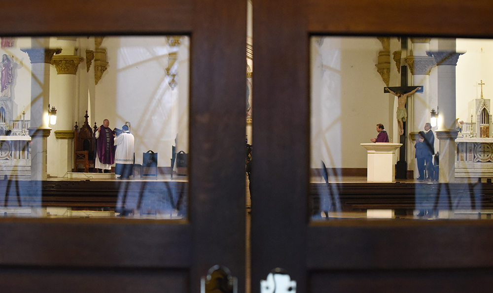 A view behind closed doors as Bishop Edward J. Burns celebrates a livestream Sunday Mass at the Cathedral Shrine of the Virgin of Guadalupe March 22, 2020 in Dallas. The Sunday Mass was livestreamed due to concerns about the spread of COVID-19. (Ben Torres/Special Contributor)