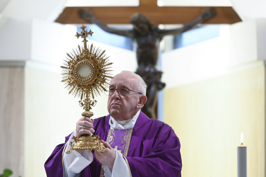 Pope Francis raises the monstrance during eucharistic adoration at the end of Mass March 26, 2020, in the chapel of his Vatican residence, the Domus Sanctae Marthae. About a dozen priests also live in the Vatican guesthouse and news reports March 25 said one of them, an Italian monsignor working in the Vatican Secretariat of State, had tested positive for COVID-19. (CNS photo/Vatican Media)