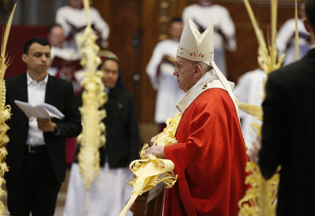 Pope Francis carries palm fronds as he walks in procession at the start of Palm Sunday Mass in St. Peter’s Basilica at the Vatican April 5, 2020. The Mass was celebrated without the presence of the public as Italy battles the coronavirus. (CNS photo/Paul Haring)
