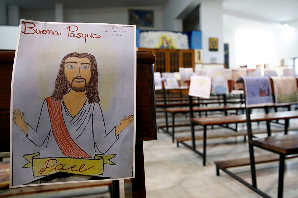 One of the many drawings done by children in the congregation is seen decorating one of the empty pews in a church in Catania, Italy, ahead of a Holy Thursday Mass, April 9, 2020. Public Masses in Italy still were not allowed. (CNS photo/Antonio Parrinello, Reuters)