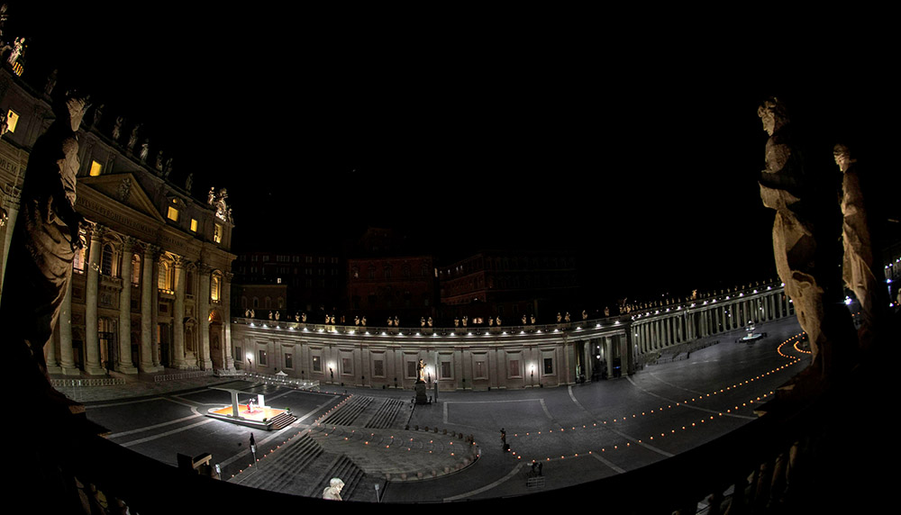 Pope Francis leads the Via Crucis procession in St. Peter’s Square at the Vatican April 10, 2020. The Good Friday service was held with no public participation because of the COVID-19 pandemic. (CNS photo/Claudio Peri, pool via Reuters)