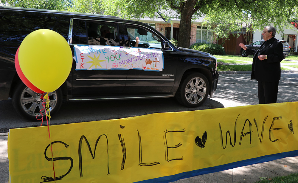 Msgr. Donald Zimmerman, longtime pastor of Christ the King Catholic Church in Dallas, waves April 26, 2020 to an SUV of well-wishers in front of the school. arrying a sign that says, Msgr. Zimmerman announced earlier in April that he would retire as of July 1, 2020 after 47 years as a priest and 26 of those years at Christ the King Catholic Church.
