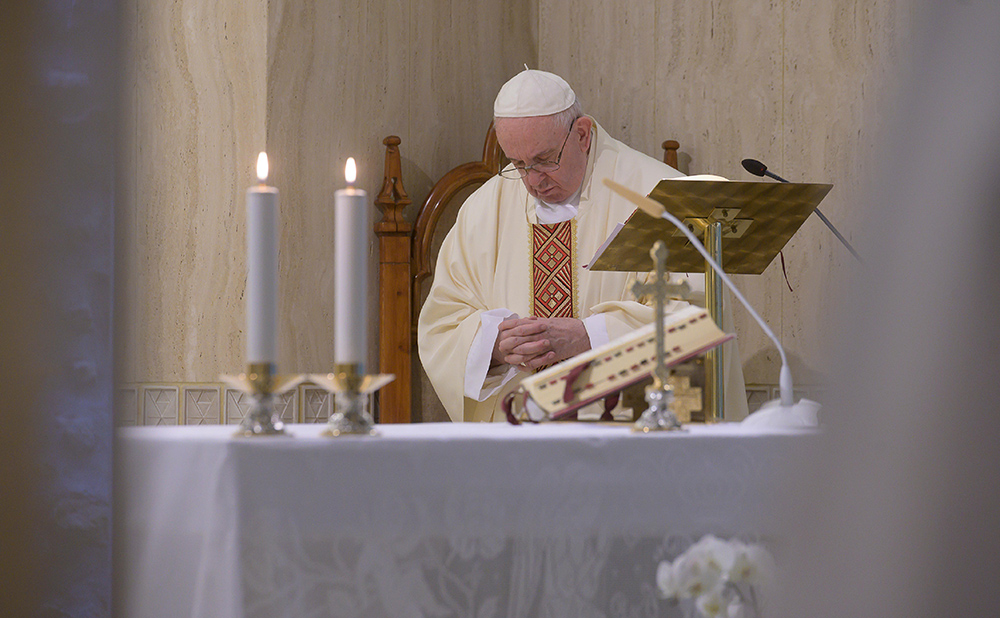 Pope Francis arrives for Mass in the chapel of the Domus Sanctae Marthae May 6, 2020. The pope offered his early morning Mass for journalists and members of the media who, despite the risks, work tirelessly to inform the public of the ongoing pandemic. (CNS photo/Vatican Media) See POPE-MASS-MEDIA May 6, 2020.