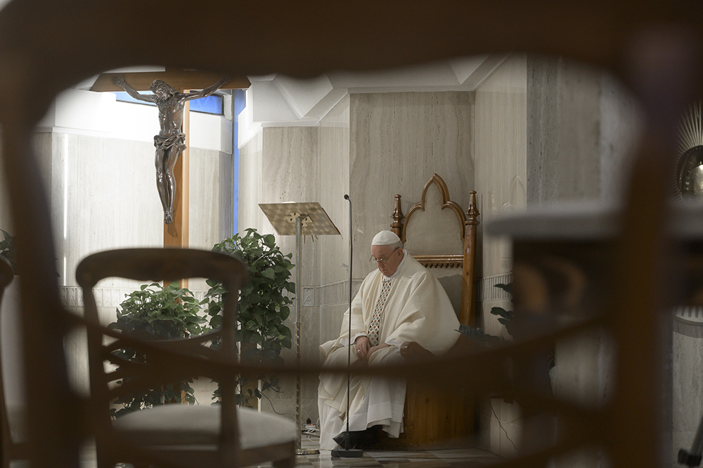 Pope Francis listens to the Scripture readings at Mass May 12, 2020, in the chapel of his Vatican residence, the Domus Sanctae Marthae. (CNS photo/Vatican Media)