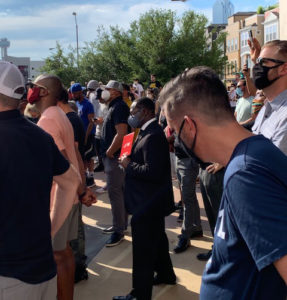 A photo by Bishop Greg Kelly showing the crowd gathered for a prayer gathering held by Dallas clergy in front of police headquarters on May 31.