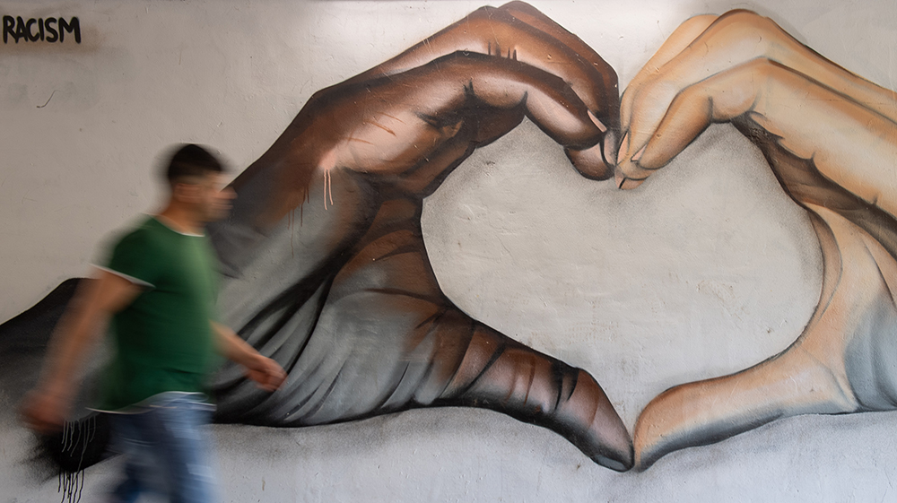 A man walks past an anti-racism mural by street artist Nath Murdoch in Peterborough, England, June 2, 2020. (CNS photo/Joe Giddens, PA Images via Reuters)