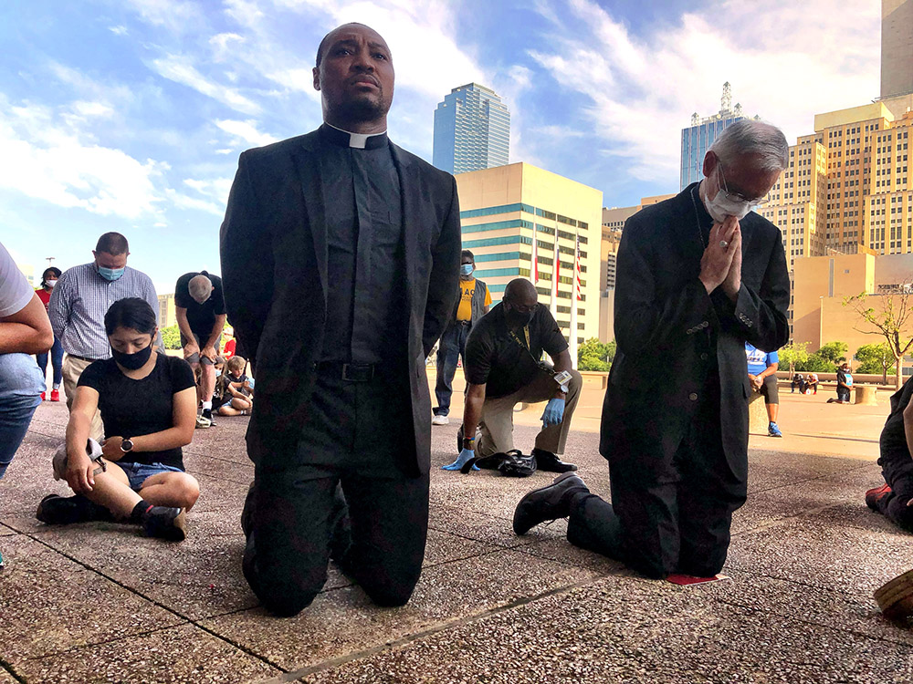 Father Arthur Unachukwa, left, incoming pastor at Holy Cross Catholic Church in Oak Cliff, and Auxiliary Bishop Greg Kelly kneel for 8 minutes and 46 seconds during a prayer service at Dallas City Hall on June 5.