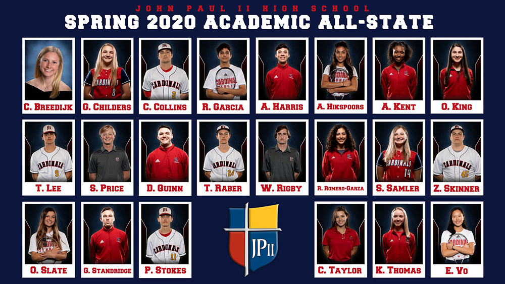 Despite a shortened Spring athletics season, John Paul II High School added 22 Academic All-State award winners to its list. Baseball (5), Golf (3), Softball (2), Tennis (4), and Track (8) all nominated athletes with 3.5+ GPAs to the TAPPS office, making it the first time the Cardinals have had more than 20 Academic All-State winners in a single season. In all, JPII honored 45 Academic All-State athletes this year, an all-time high breaking last year’s previous record of 37.
