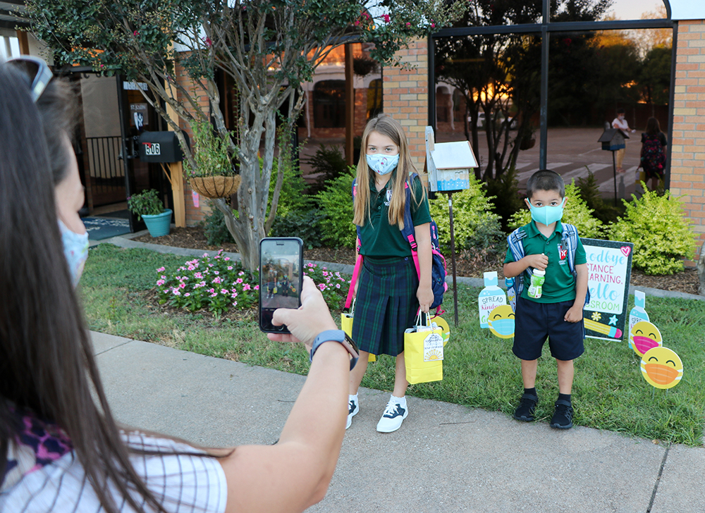 A mother takes a photo of students on the first day of school at St. Joseph Catholic School in Waxahachie.