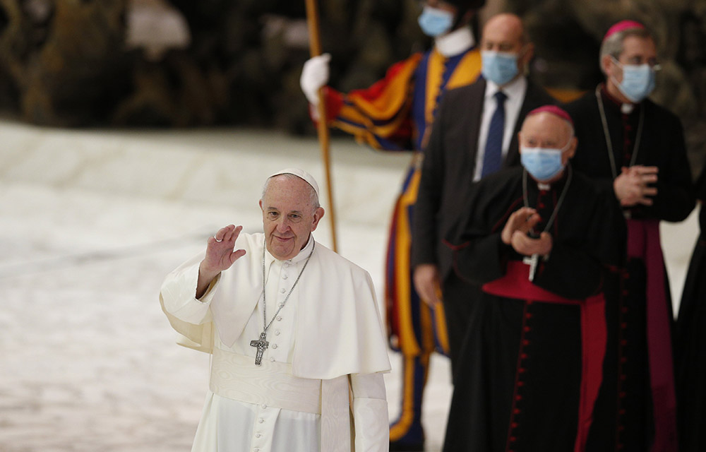 Pope Francis greets the crowd during his general audience in the Paul VI hall at the Vatican Oct. 21, 2020. (CNS photo/Paul Haring)