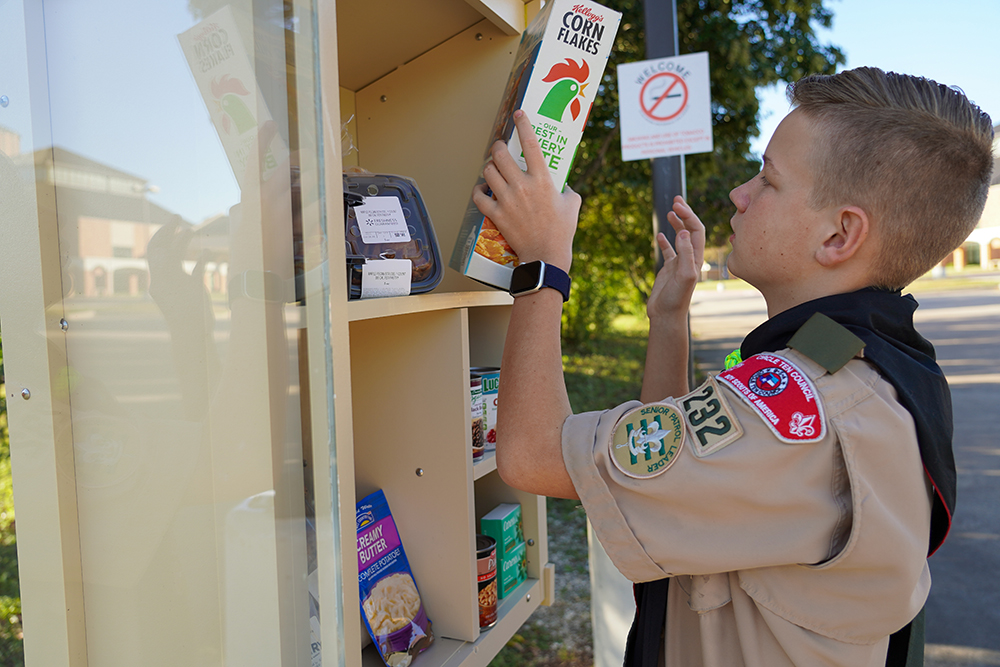 “It’s to help people in the community who are struggling financially and struggle to put food on the table,” said Smith, 13, a third generation Eagle Scout, following in the footsteps of his father and grandfather. “People from around the community will donate food to the box for those in the community who are struggling. Those who need items are free to come get them.”