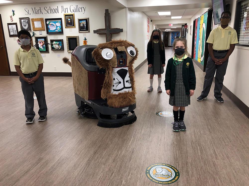 St. Mark students pose with the new cleaning robot dressed like a Lion, the school’s mascot. Pictured clockwise from bottom left, Francis Curian, Addison Samples, Tyler Ezetendu and Vivienne Emery.