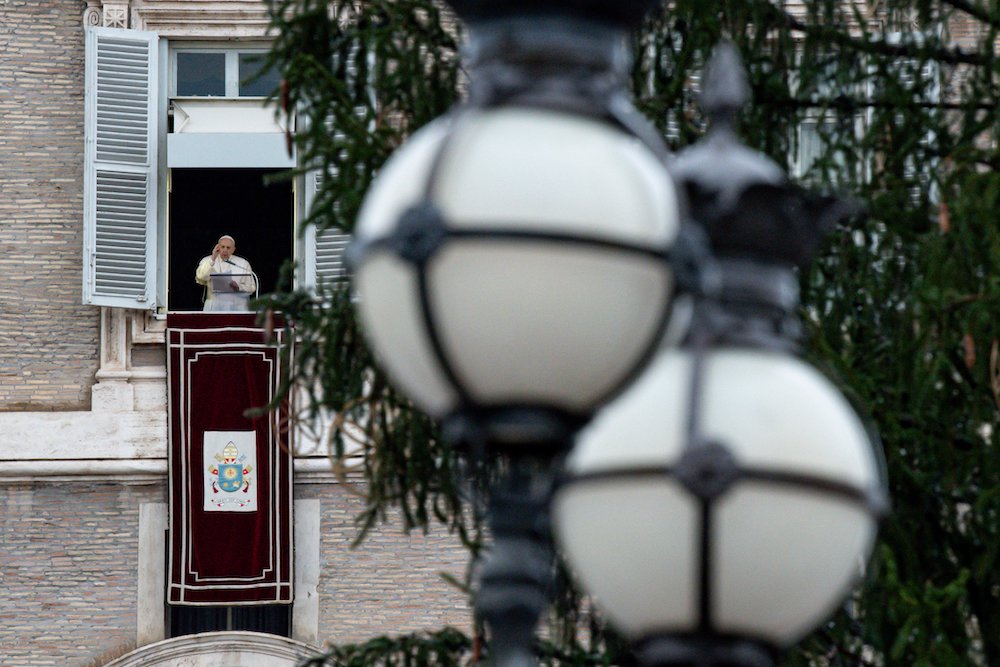 Pope Francis leads the Angelus from the window of his studio overlooking St. Peter’s Square at the Vatican Dec. 6, 2020. No pandemic and no kind of crisis can extinguish the light of Christ, the pope said to visitors gathered in the square. (CNS photo/Vatican Media)