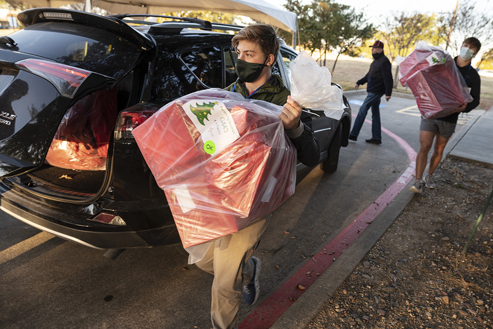 Eighth grader Jack Freeman, left, and his brother sophomore Luke Freeman, right, carry bags full of toys as the brothers and other students from Jesuit College Preparatory School distributed Christmas gifts at Santa Clara Catholic Parish in Dallas, on Saturday, Dec. 12, 2020. The Angels of Charity and Archangels Men’s Network, auxiliary groups of Catholic Charities Dallas, spearheaded the gift distribution along with the assistance from Jesuit students on Saturday morning. (Ben Torres/Special Contributor)