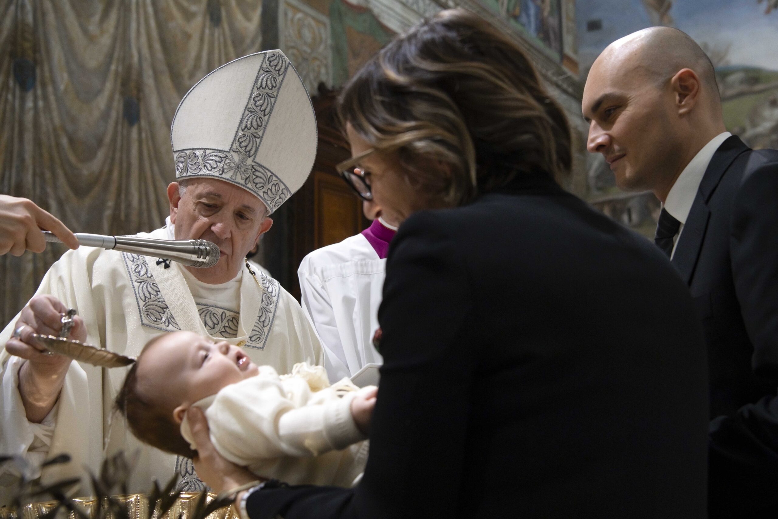 Pope Francis baptizes one of 32 babies as he celebrates Mass on the feast of the Baptism of the Lord in the Sistine Chapel at the Vatican Jan. 12, 2020. Because of the COVID-19 pandemic, Pope Francis will not baptize infants this year on the feast of the baptism of the Lord. (CNS photo/Vatican Media)