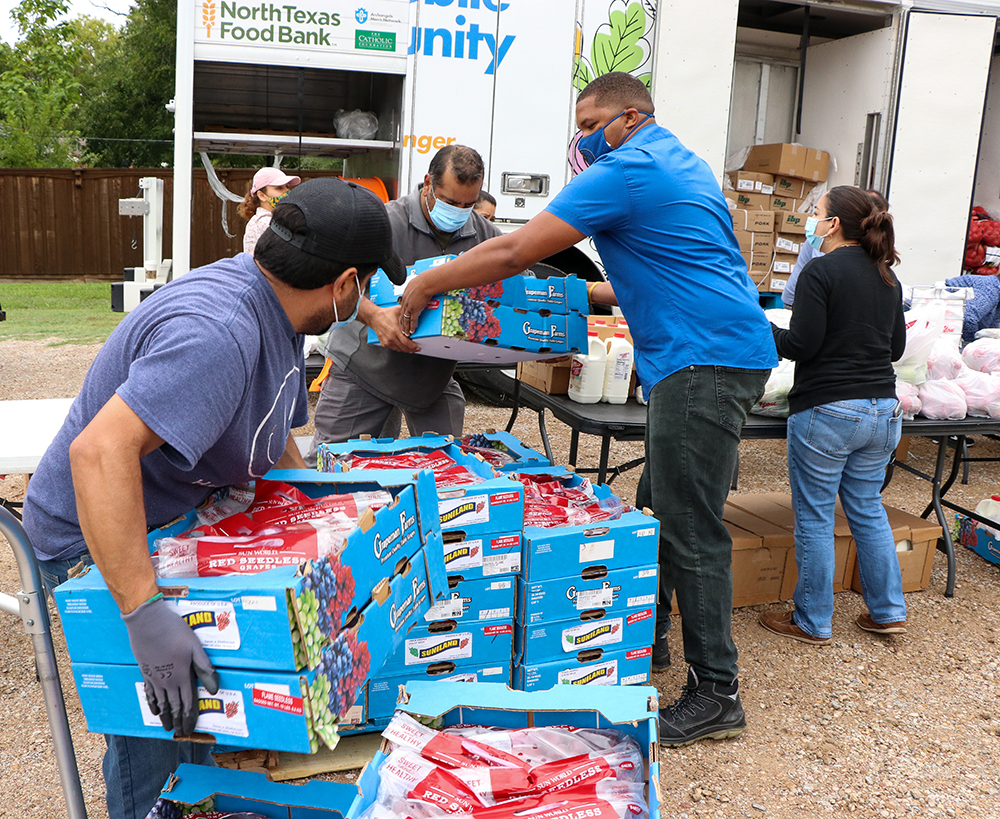 Volunteers unload fresh produce and perishables during a Catholic Charities Dallas mobile food pantry distribution at St. Bernard of Clairvaux Catholic Church on Sept. 23, 2020. (MICHAEL GRESHAM/The Texas Catholic)