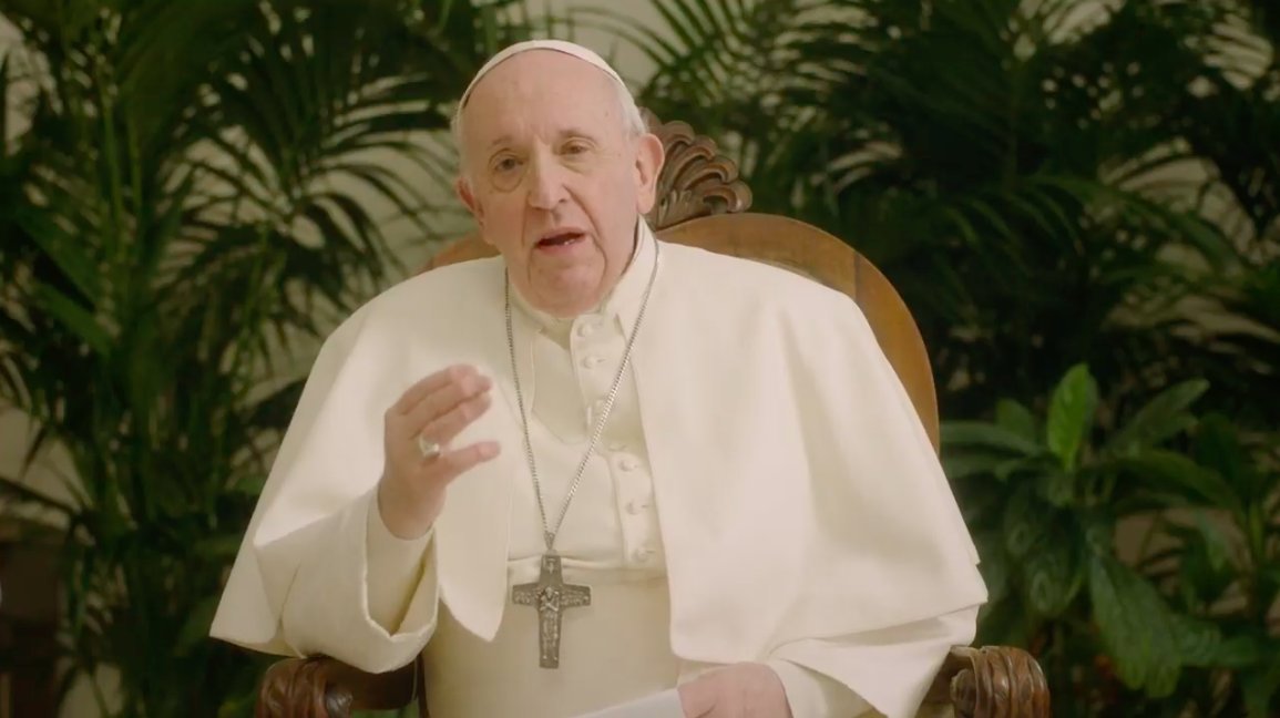 A screen capture shows Pope Francis speaking during a Feb. 4, 2021, virtual meeting marking the International Day of Human Fraternity, a new effort to promote dialogue between cultures and religions. The pope was among several world and religious leaders who participated in the meeting. (CNS photo)