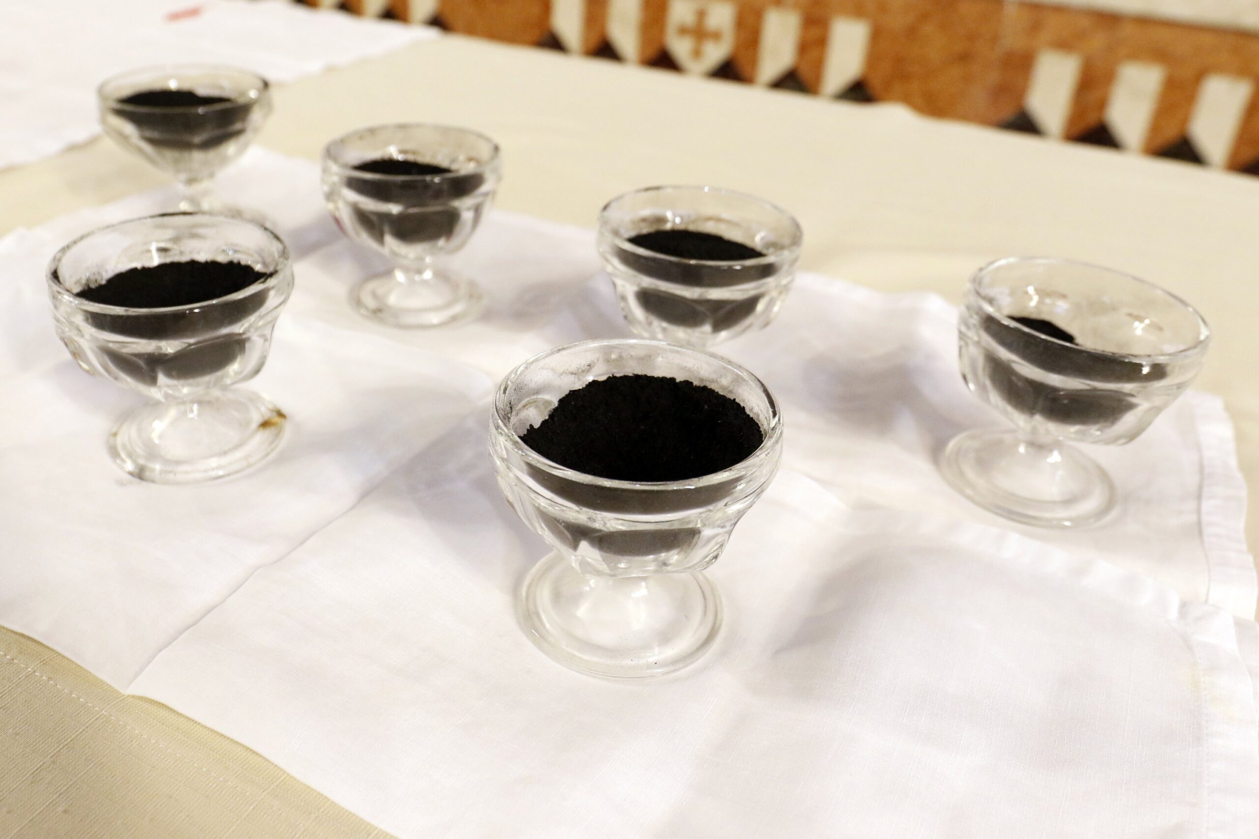 Glass cups containing ashes are seen on an altar between Ash Wednesday services at St. Ignatius Martyr Church in Long Beach, N.Y., in 2019. This year Ash Wednesday, which marks the beginning of the season of Lent, is Feb. 17. (CNS photo/Gregory A. Shemitz)