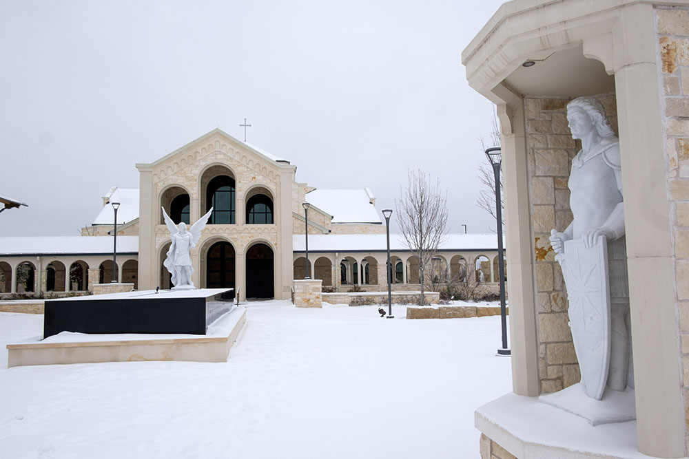 La nieve cubre el terreno de la Iglesia de San Miguel Arcángel en McKinney, el 17 de febrero, Miércoles de Ceniza.
