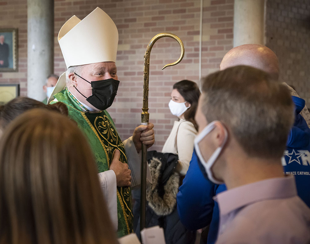 Dallas Bishop Edward J. Burns greets parishioners after celebrating Mass for the 30th anniversary at Prince of Peace Catholic Community in Plano, Texas, Sunday, Feb. 7, 2021. (Ron Heflin)