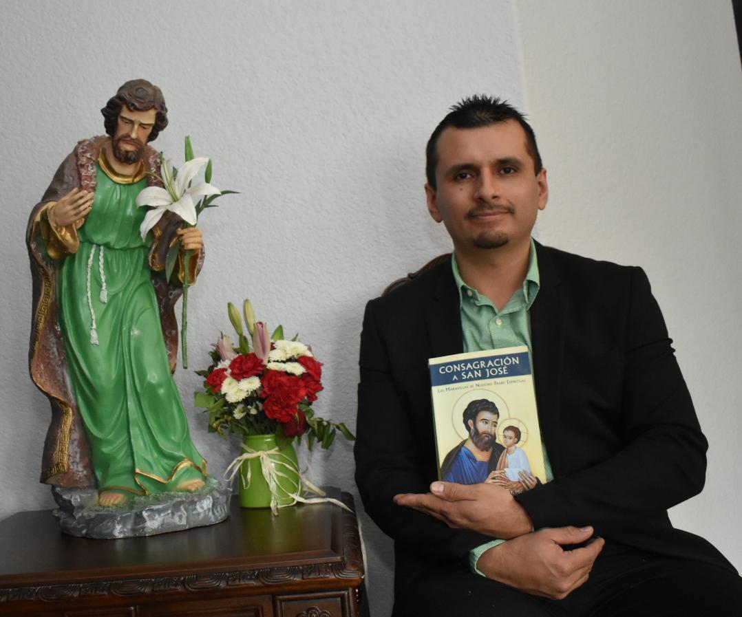 Rogelio Pulgarin, muestra el libro Consagración a San José, Las Maravillas de Nuestro Padre Espiritual, del padre Donald H. Calloway, con el que se preparó durante 33 días para consagrarse al patrono de la Iglesia.