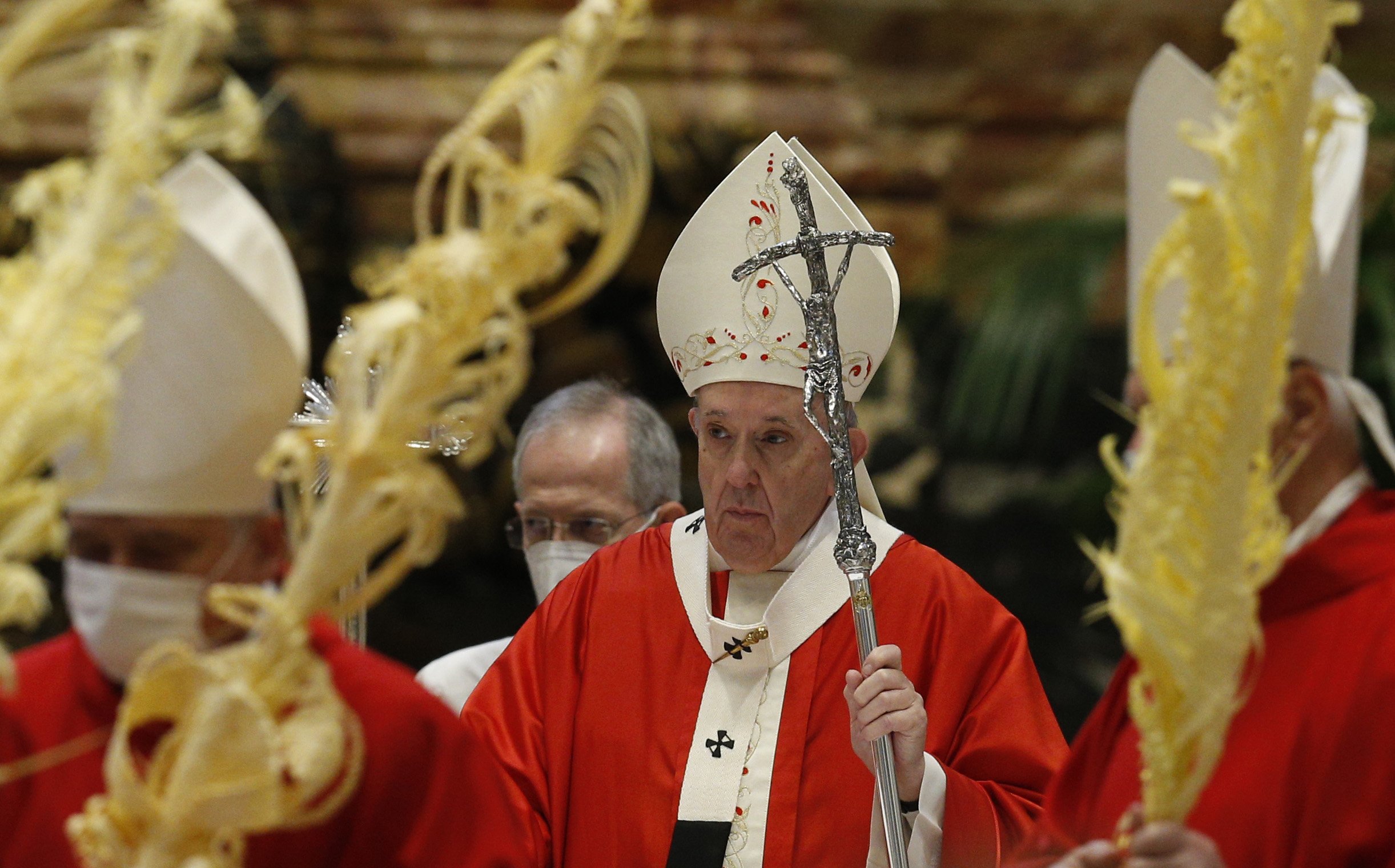 Palm Sunday Mass, the liturgy that begins with a commemoration of Jesus entering Jerusalem among a jubilant crowd, began with a small procession toward the Altar of the Chair in St. Peter’s Basilica with a few dozen concelebrating cardinals and bishops walking ahead of Pope Francis.