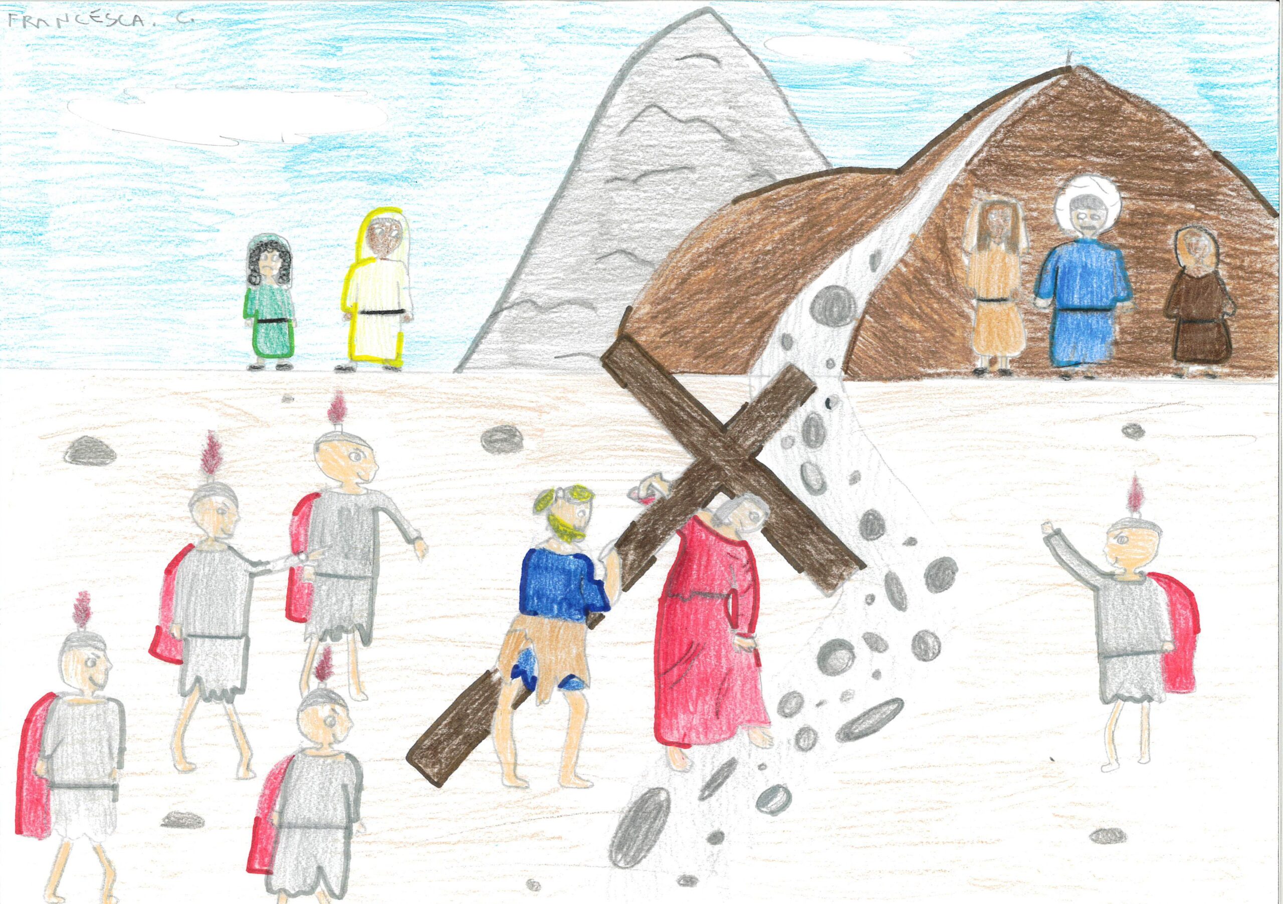 This drawing by a child at an Italian parish helps illustrate a booklet for Pope Francis’ April 2, 2021, commemoration of the Way of the Cross. Like last year, the service on Good Friday will be held in St. Peter’s Square without the presence of the general public. (CNS photo/Libreria Editrice Vaticana)