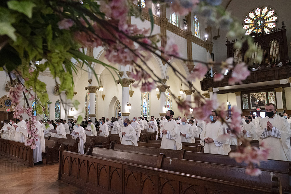 Dallas priests stand for prayer at the start of the Celebration of the Chrism Mass with Bishop Edward Burns at the Cathedral Shrine of the Virgin of Guadalupe in Dallas, on Tuesday, March 30, 2021. (Ben Torres/Special Contributor)