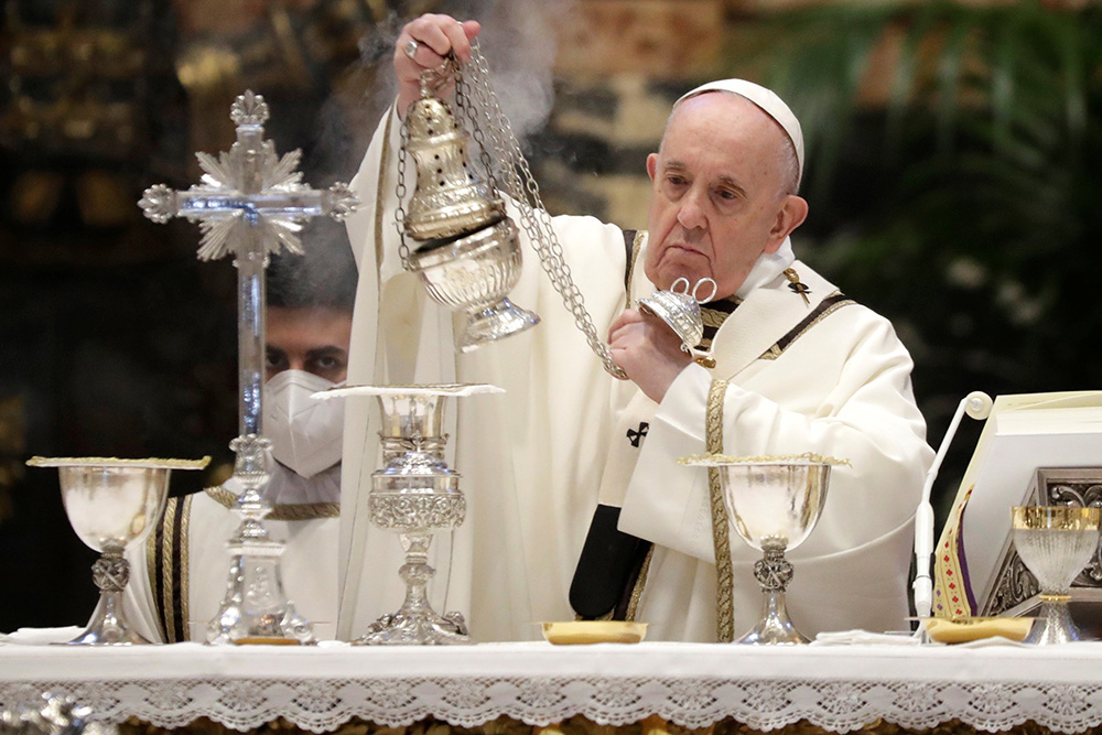 Pope Francis burns incense as he celebrates Holy Thursday chrism Mass in St. Peter’s Basilica at the Vatican April 1, 2021. (CNS photo/Andrew Medichini, Reuters pool)