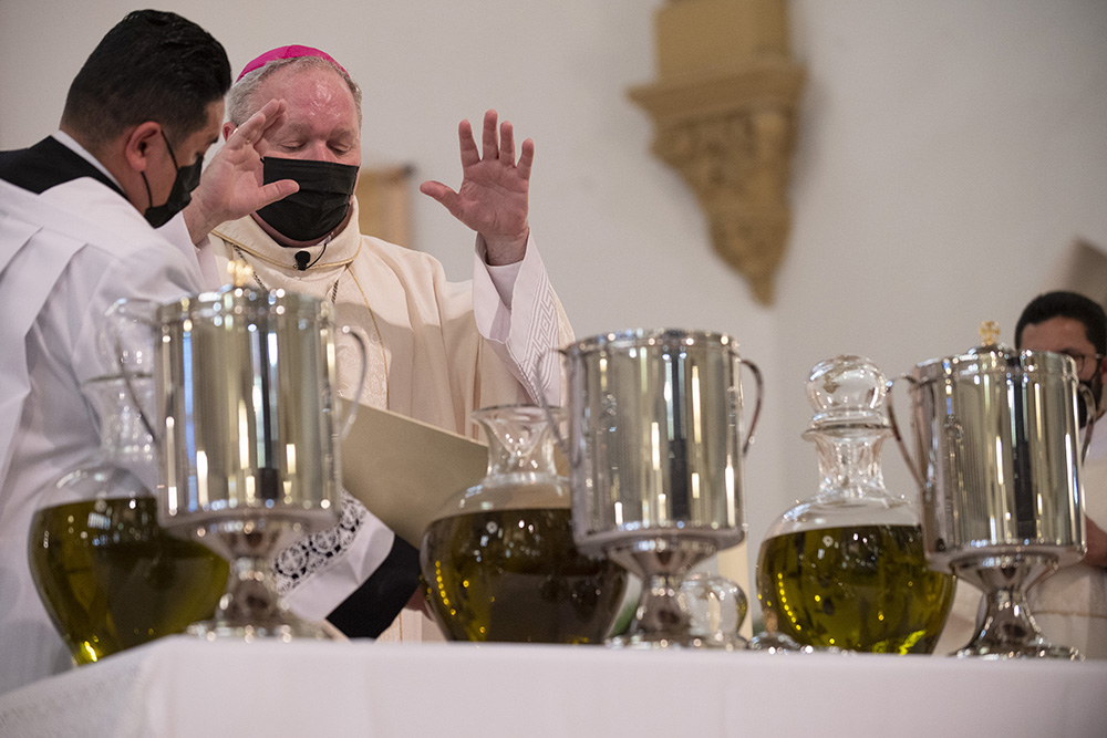 Bishop Edward J.Burns consecrates the Holy Chrism during the Chrism Mass at the Cathedral Shrine of the Virgin of Guadalupe on March 30, 2021. (Ben Torres/Special Contributor)