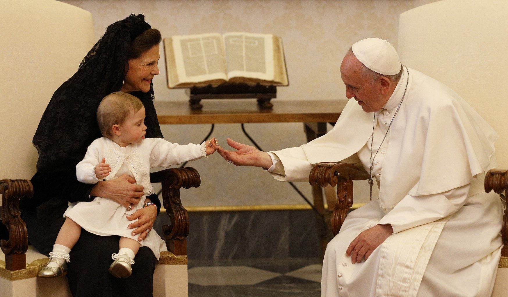 Princess Leonore, held by Sweden’s Queen Silvia, gives a papal key chain to Pope Francis during her grandmother’s private audience with Pope Francis in the Apostolic Palace at the Vatican in this April 27, 2015, file photo. The pope has chosen the theme, “I am with you always,” for the first World Day for Grandparents and the Elderly, which will be celebrated July 25, 2021. (CNS photo/Paul Haring)