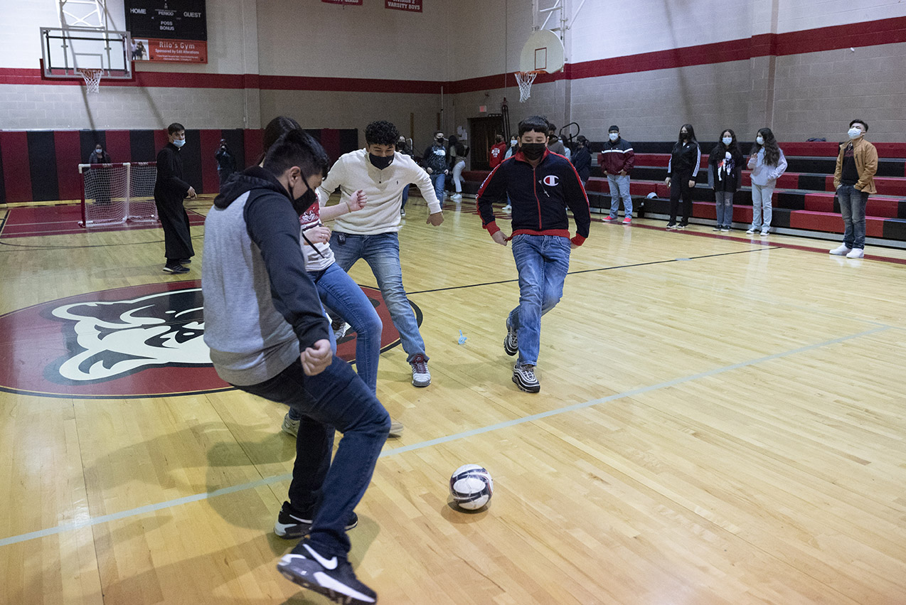 Las dinámicas que el padre Luis Prado (izq) usa como parte de las actividades del grupo Voces del Verbo, tienen componente lúdico. En la foto, un grupo de jóvenes juega fútbol durante la reunión del 5 de febrero. Foto Especial para RC/Ben TorresREVISTA CATÓLICA DALLAS