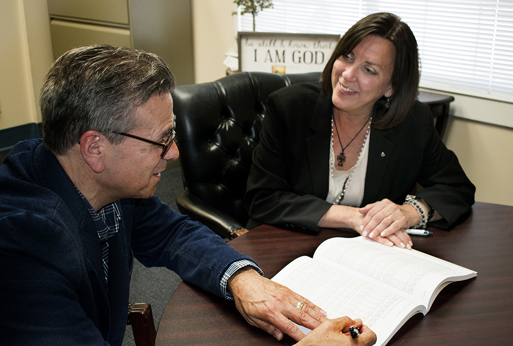 Geralyn Kaminsky, right, the new executive director of the Catholic Pro-Life Community, visits with CPLC board member Thomas Ruedi. (Courtesy Photo)