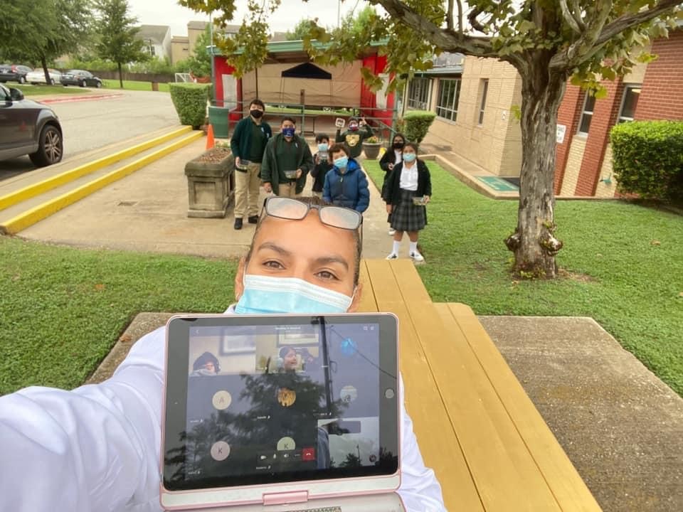 Estela Valdez, pictured holding a tablet with students, wears many hats at St. Cecilia Catholic School, serving as the assistant principal, STEM coordinator, network coordinator and middle school science teacher. Her passion for education and her school community earned her recognition as one of three recipients of the 2021 HALO Educator of the Year awards, which were announced during a virtual ceremony on May 4.