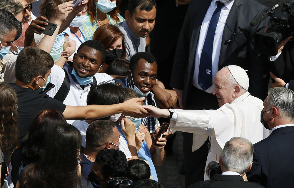 Pope Francis greets people during his general audience in the San Damaso Courtyard of the Apostolic Palace at the Vatican June 16, 2021. (CNS photo/Paul Haring)